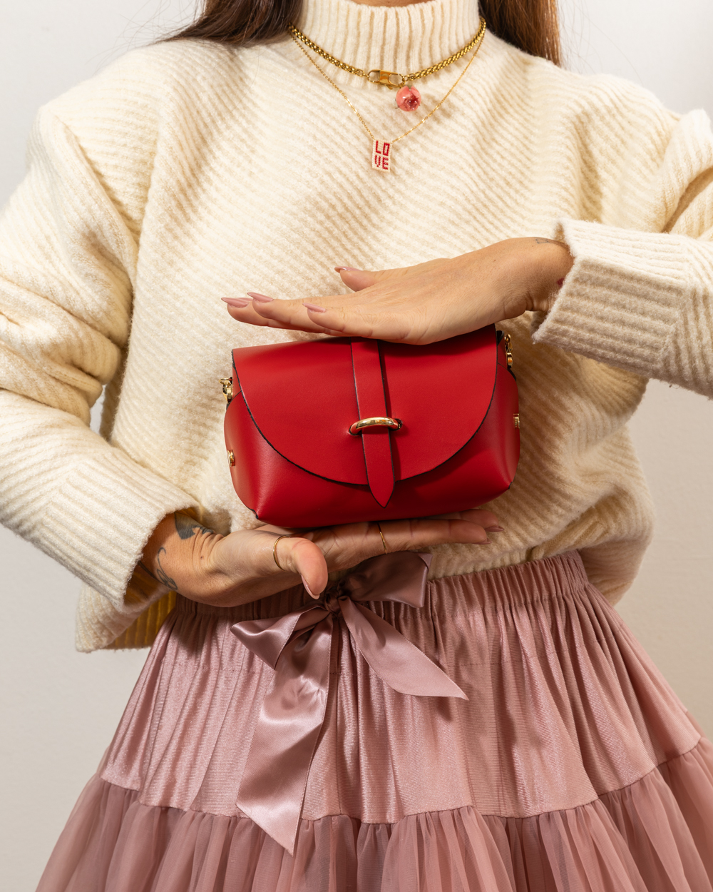 The design is essential yet full of character, highlighted by the central strap that secures the flap with an elegant gold-tone semi-circle hardware. Candy is the jewel of the collection: small in size but capable of becoming the absolute star of any look, from cocktail parties to special evenings.