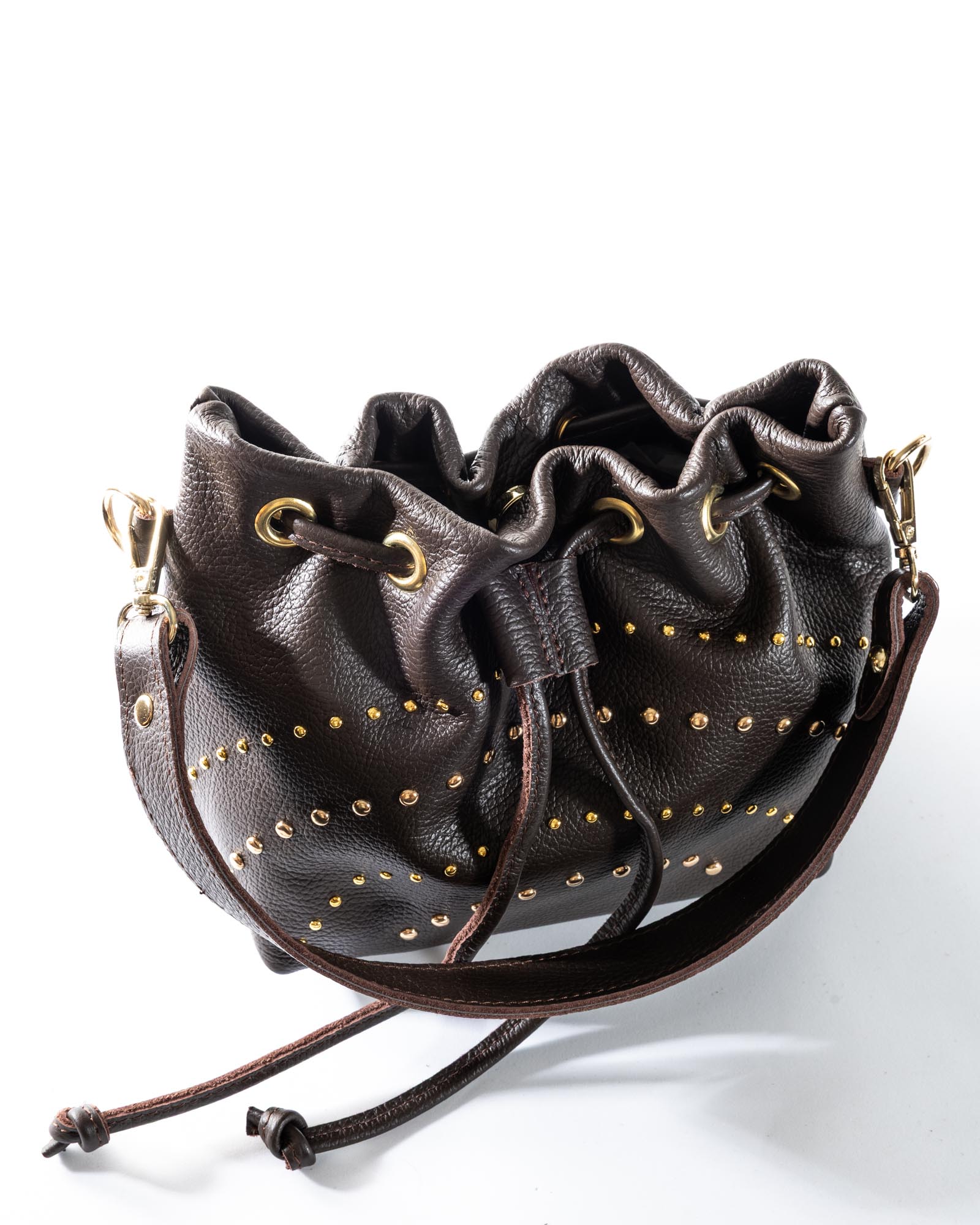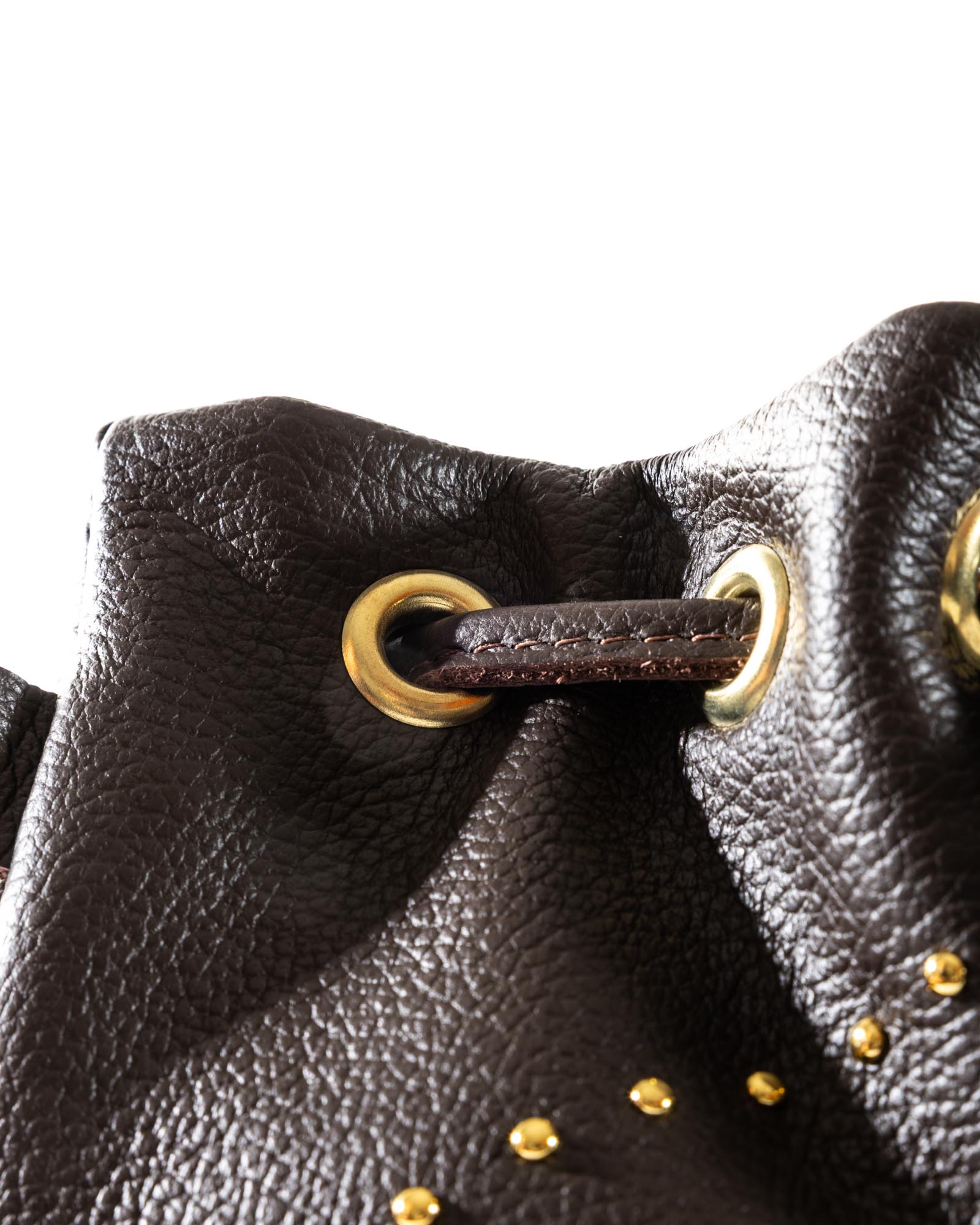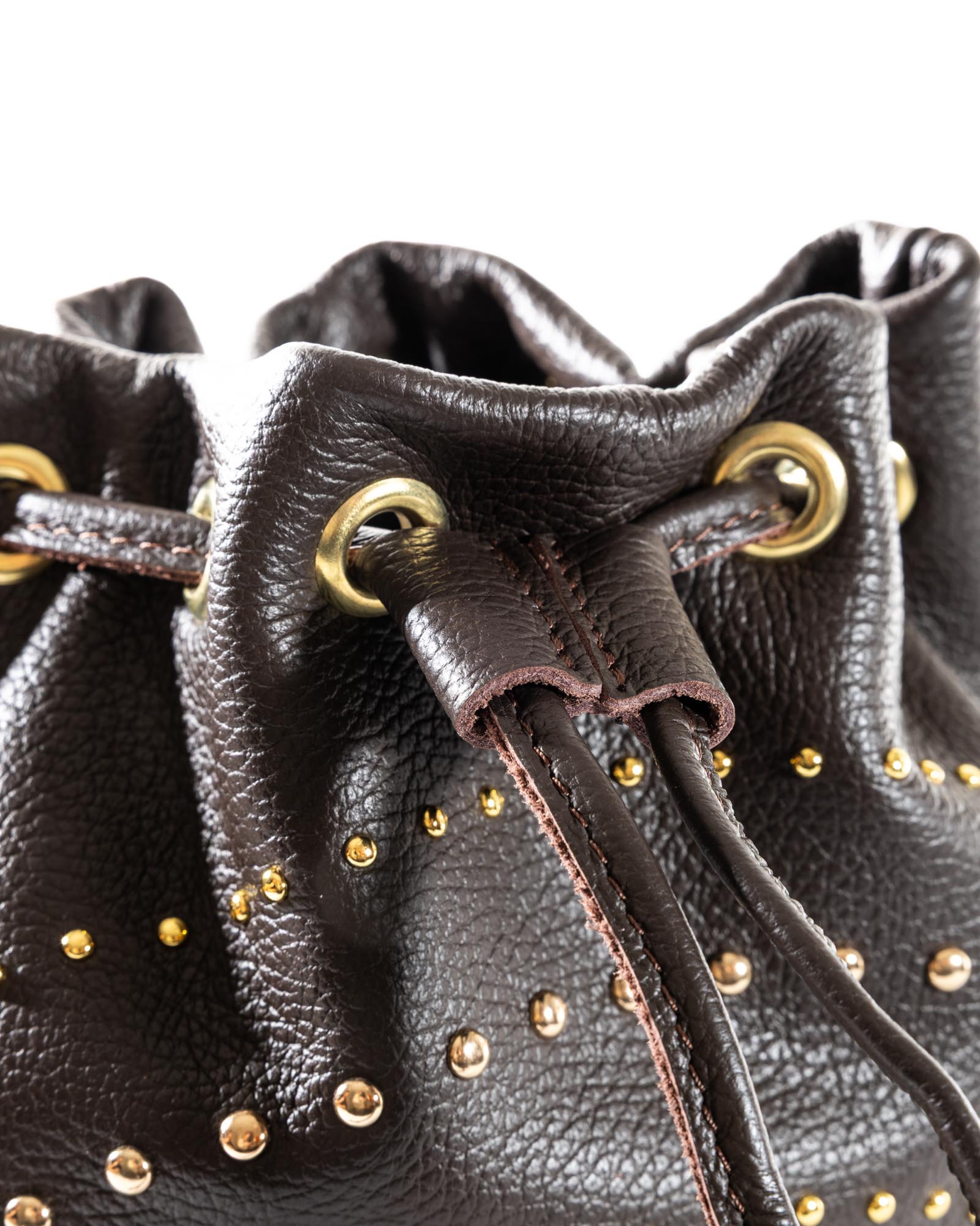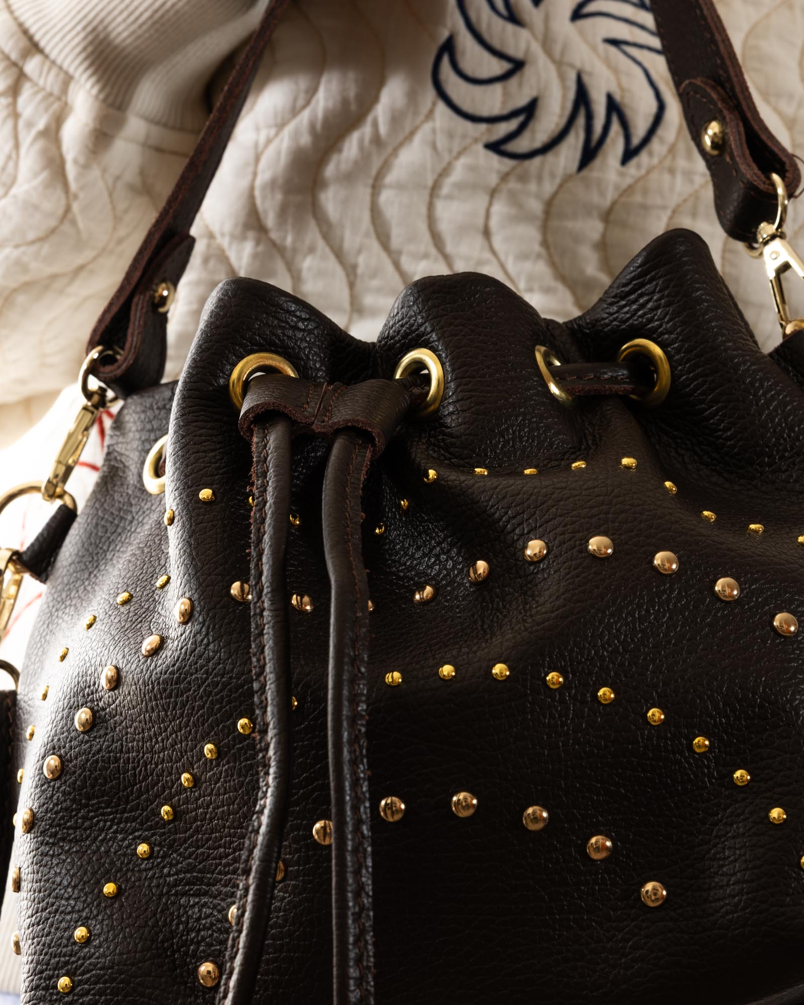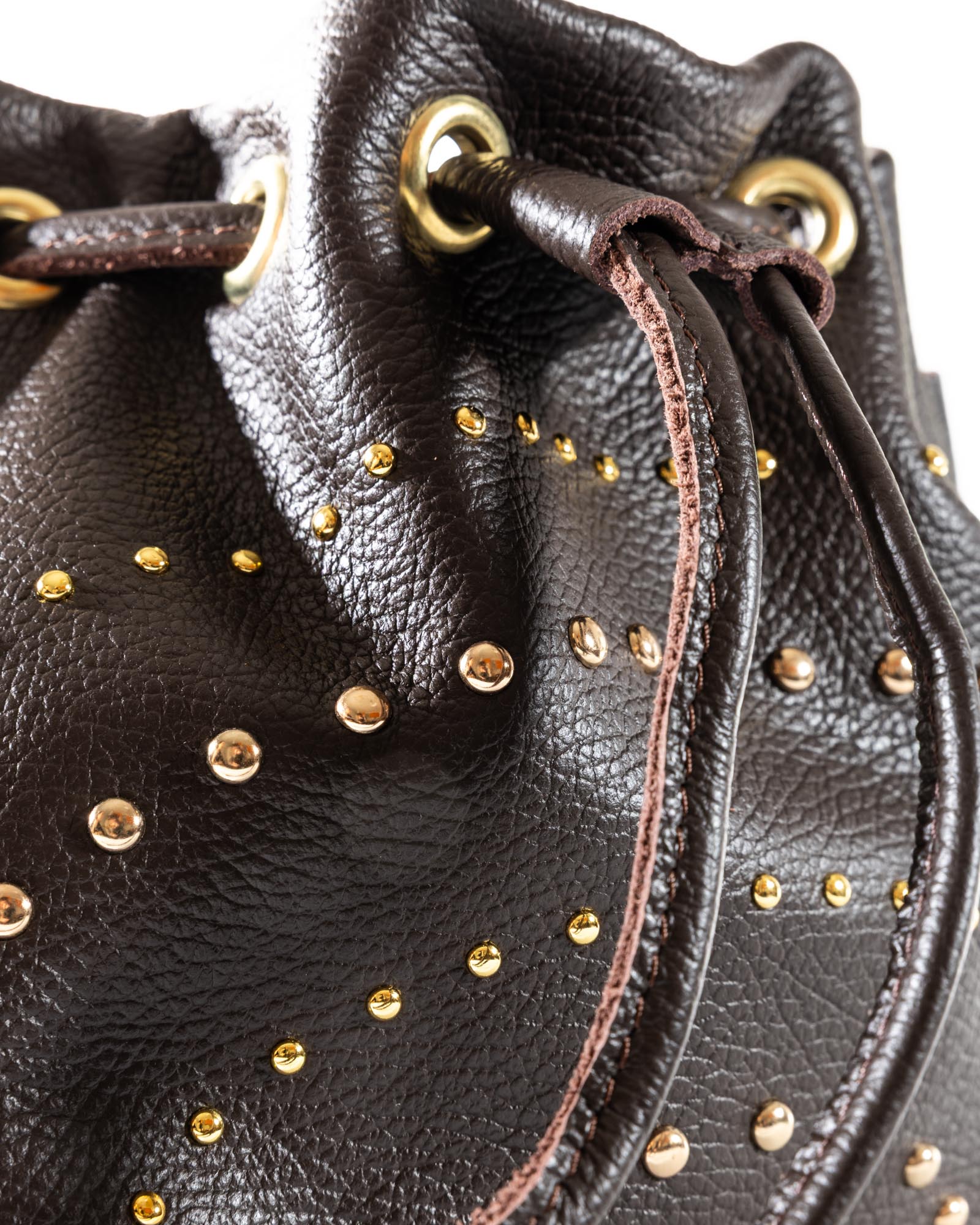 The Grace bag is the perfect balance between a soft silhouette and a bold character. Crafted from premium pebbled leather in a sophisticated powder blue (pastel azure), this bag stands out for its daring gold-toned domed studs of varying sizes, creating a dynamic and sophisticated play of light.