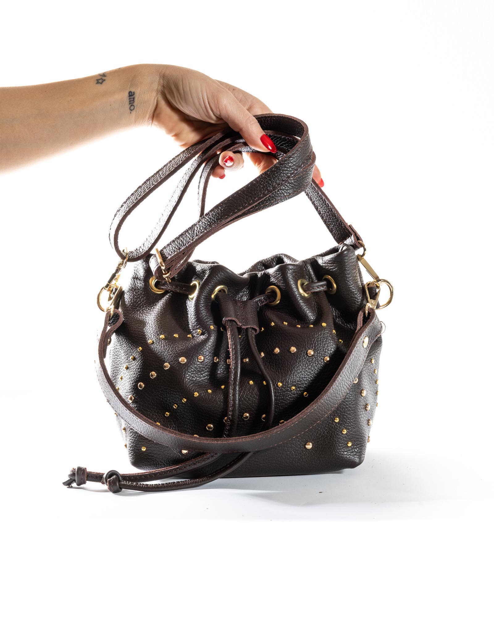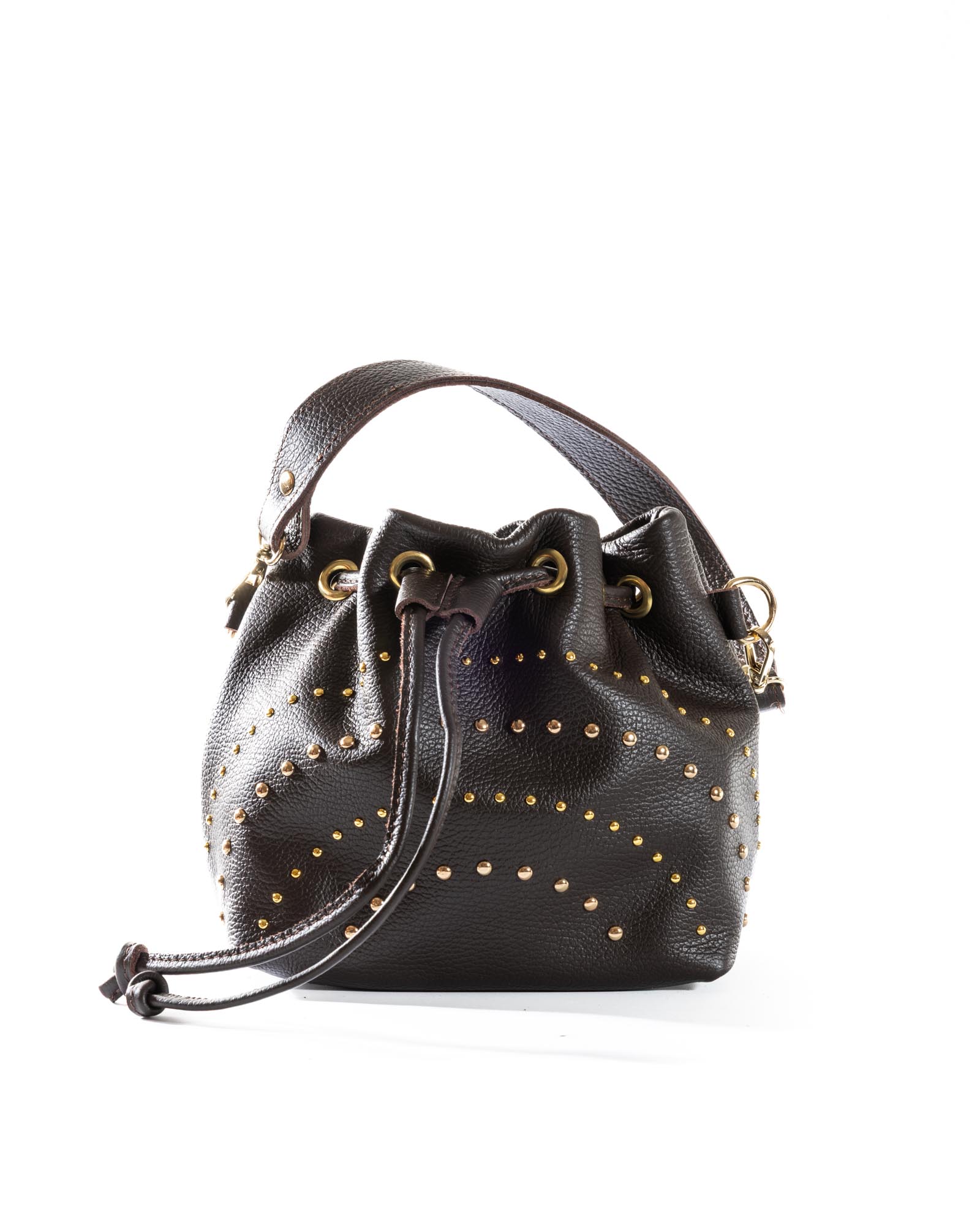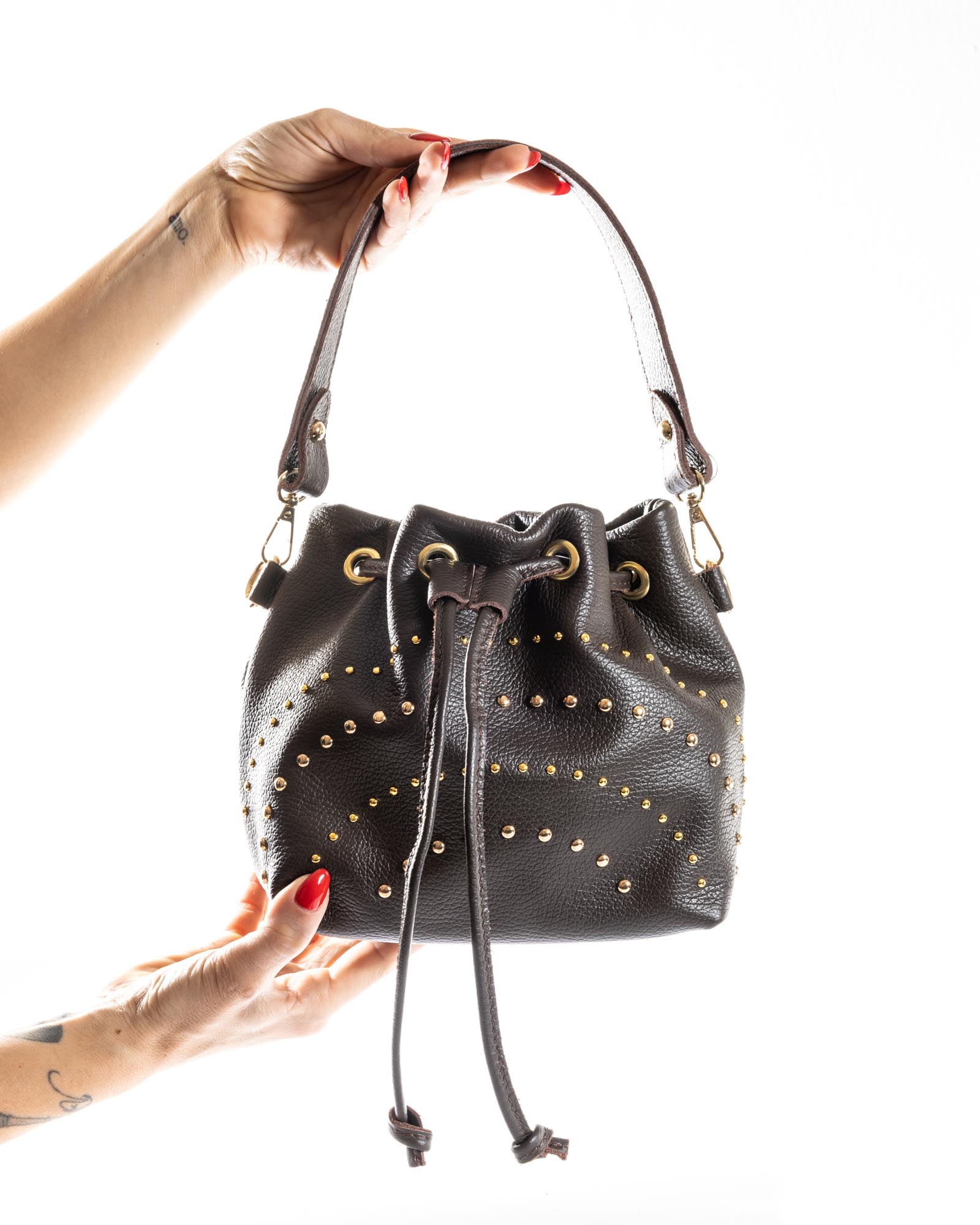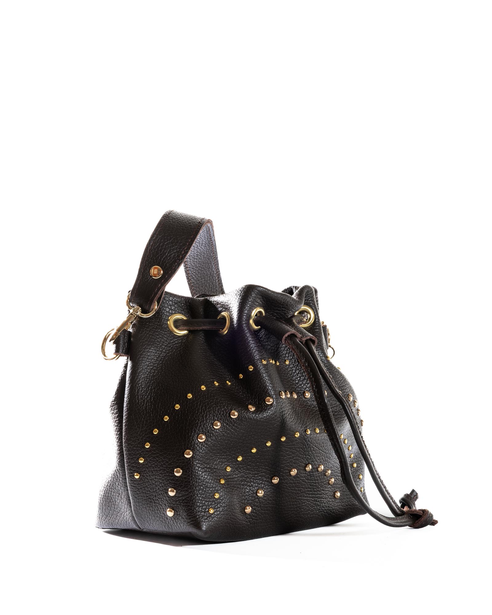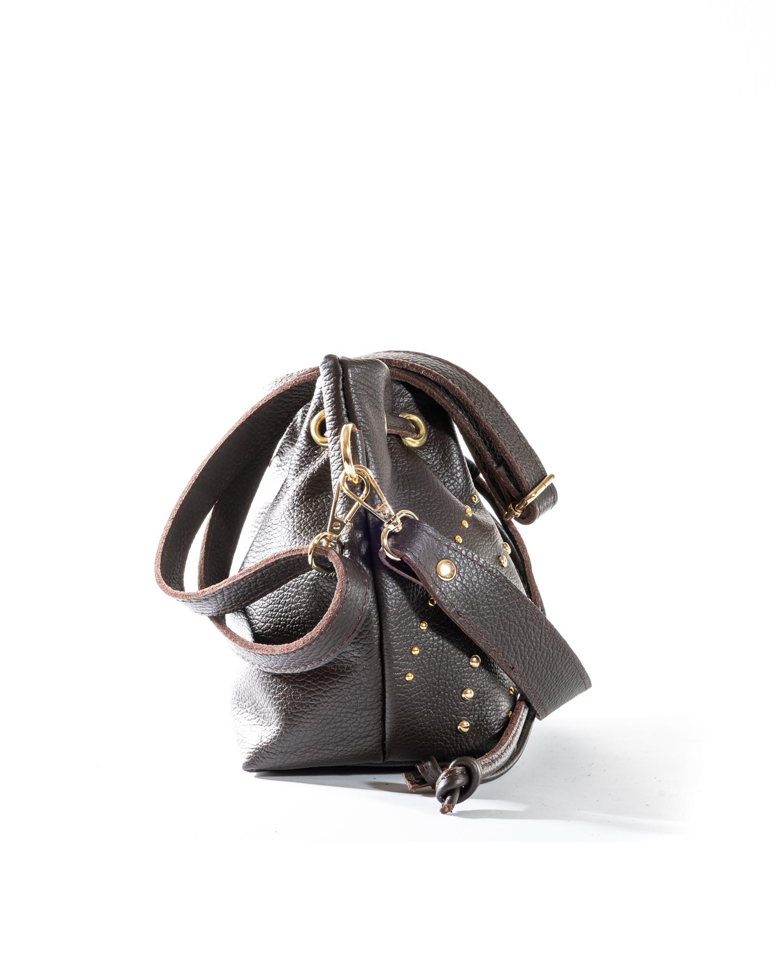 The Grace bag is the perfect balance between a soft silhouette and a bold character. Crafted from premium pebbled leather in a sophisticated powder blue (pastel azure), this bag stands out for its daring gold-toned domed studs of varying sizes, creating a dynamic and sophisticated play of light.