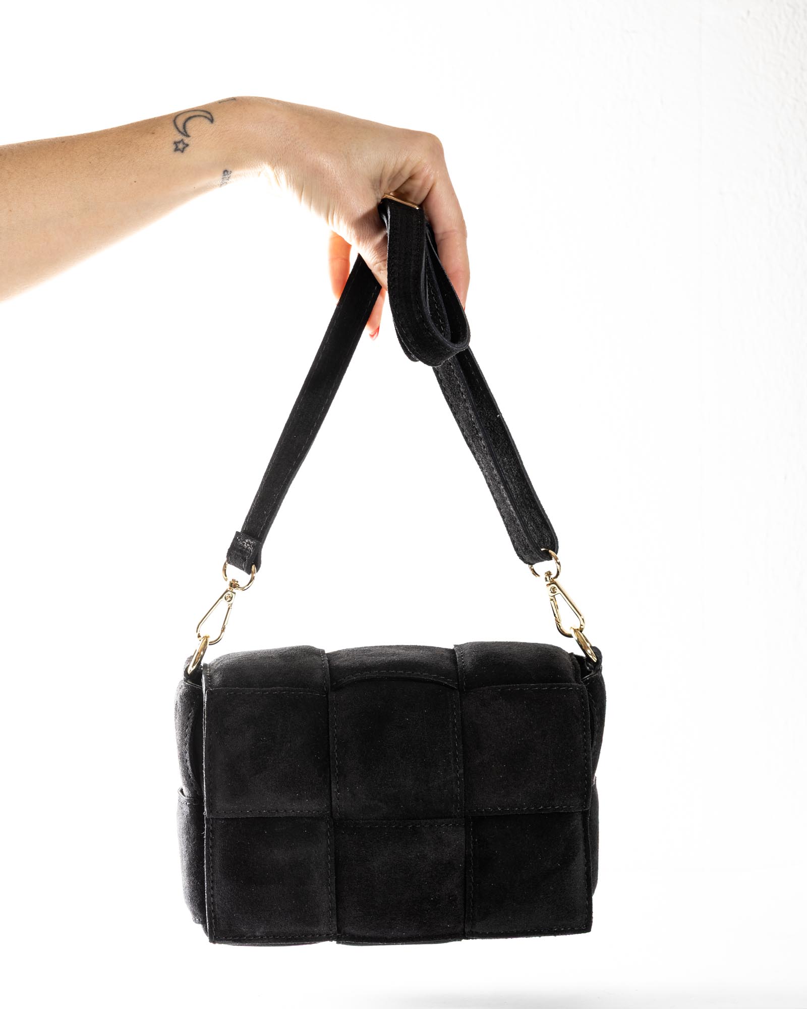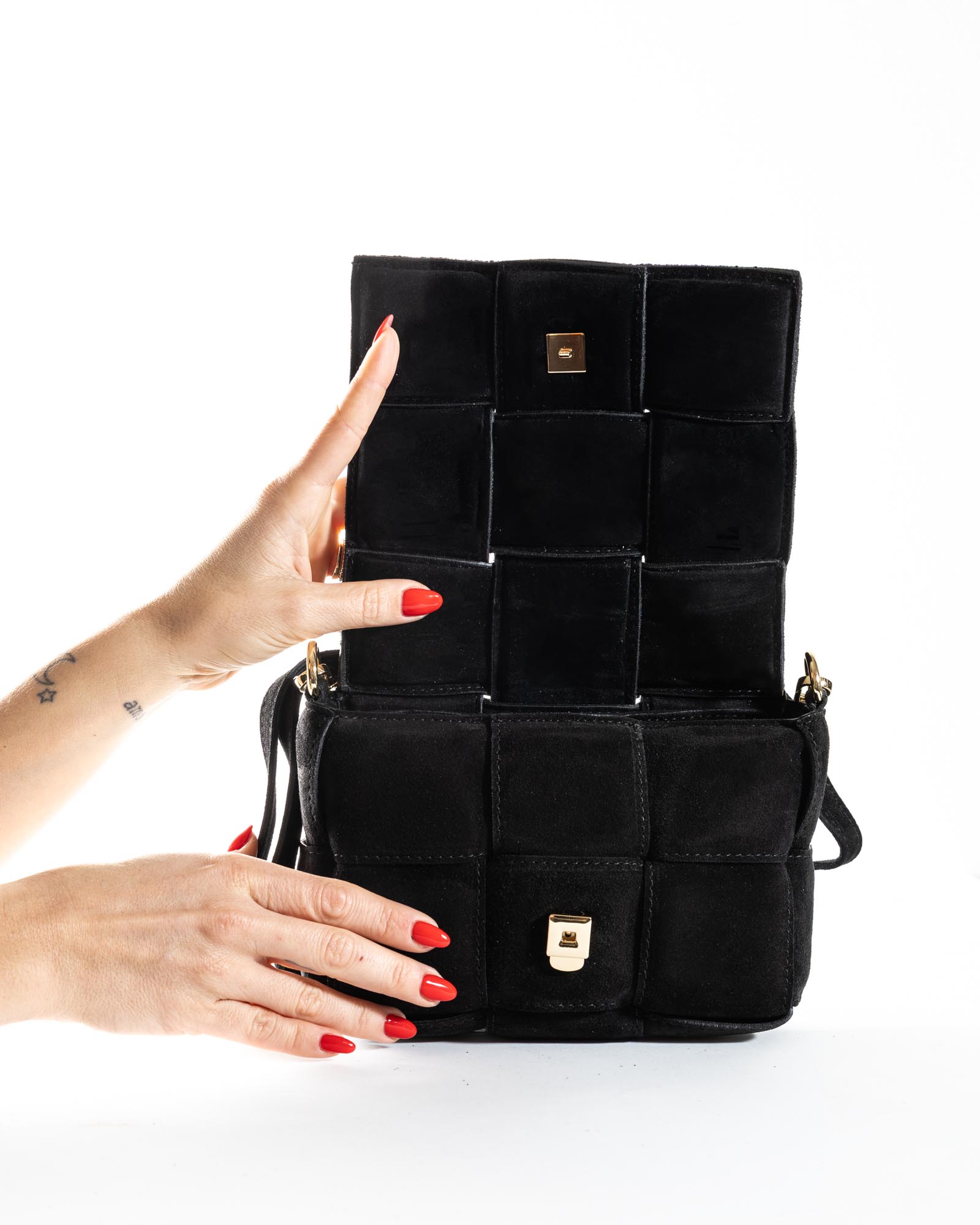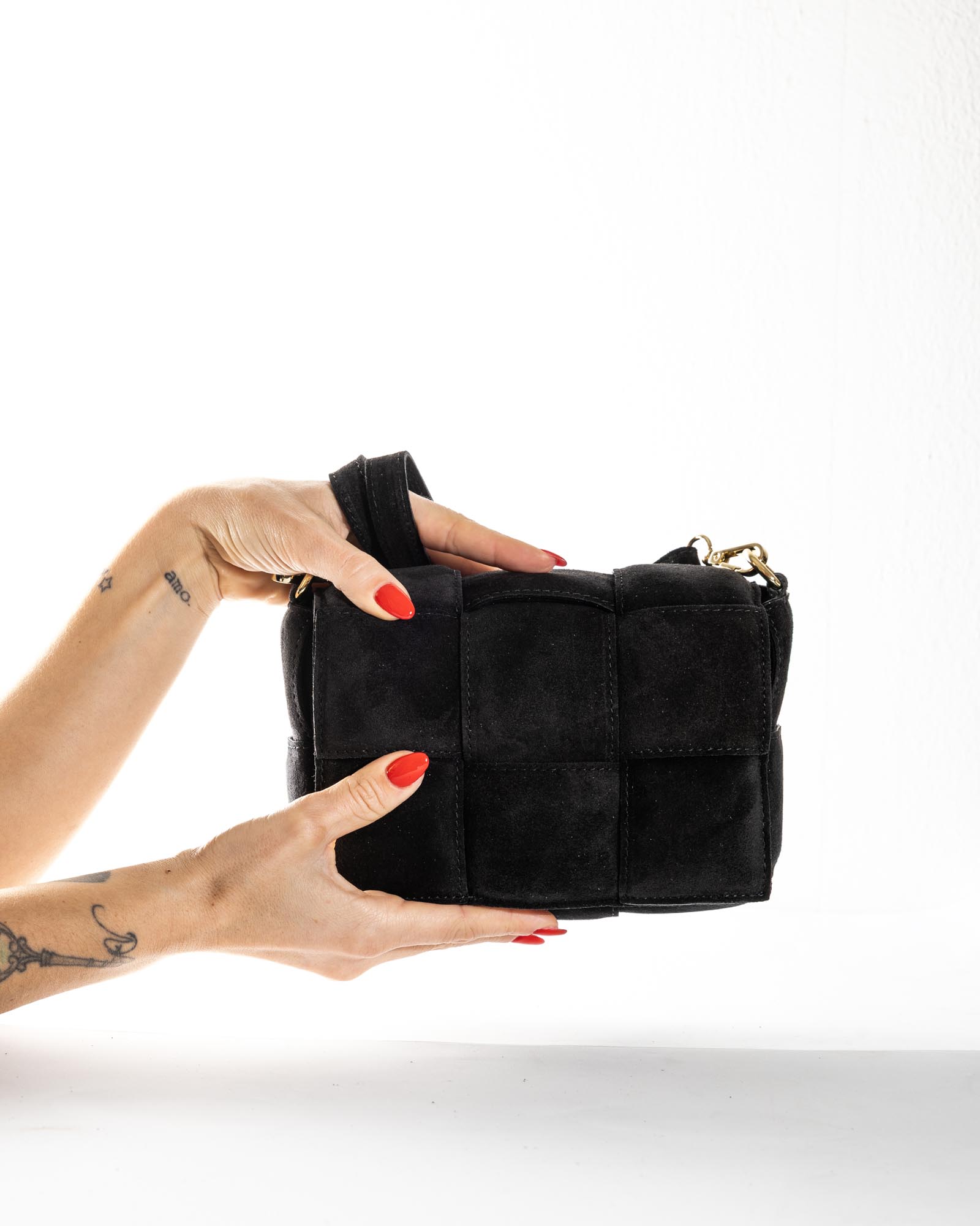 Crafted from soft suede in warm, natural tones, it is a handbag designed to accompany every moment of the day with effortless elegance. Clean lines and soft volumes evoke a timeless aesthetic, while the handcrafted woven detailing in genuine leather enhances its artisanal soul and attention to detail.