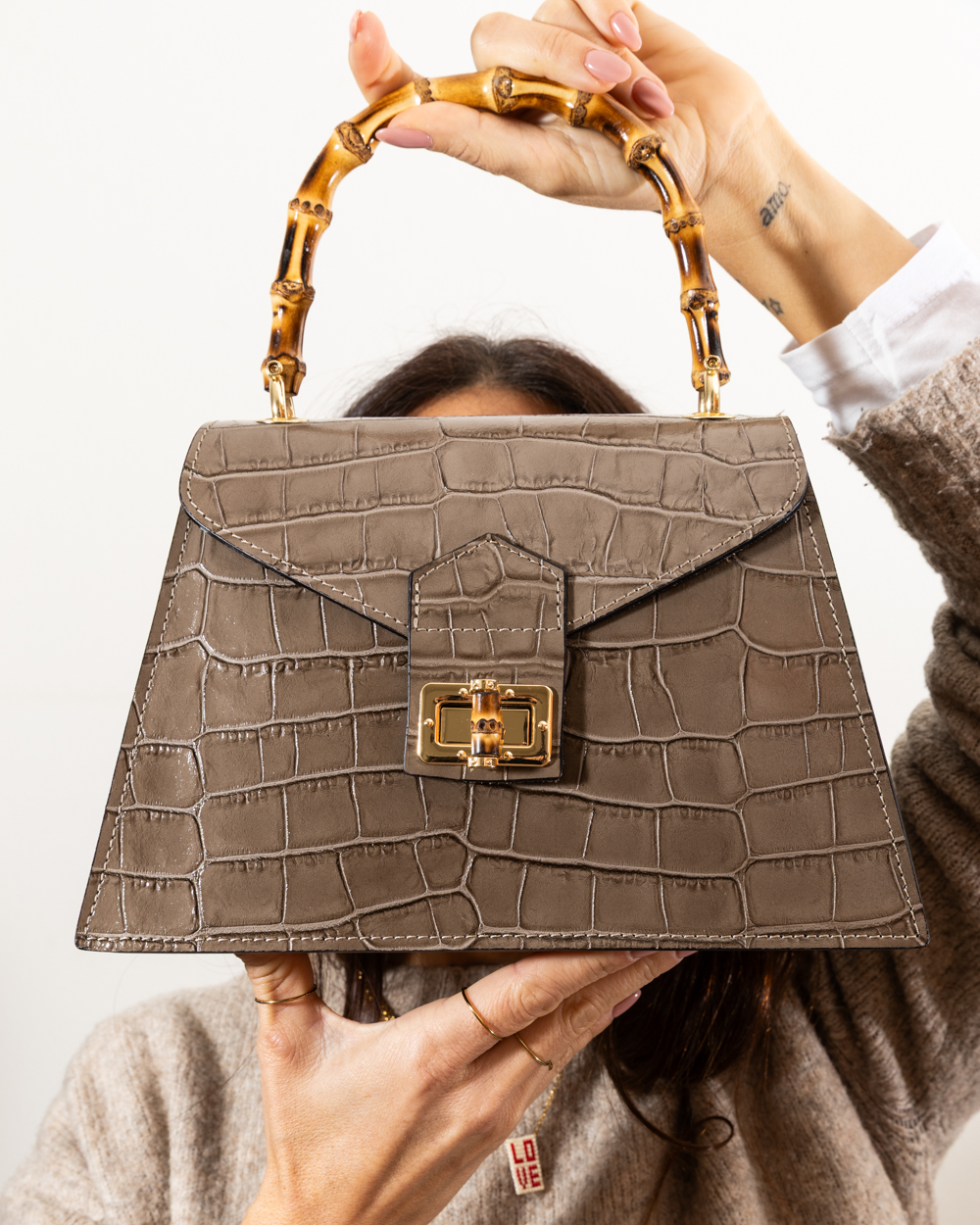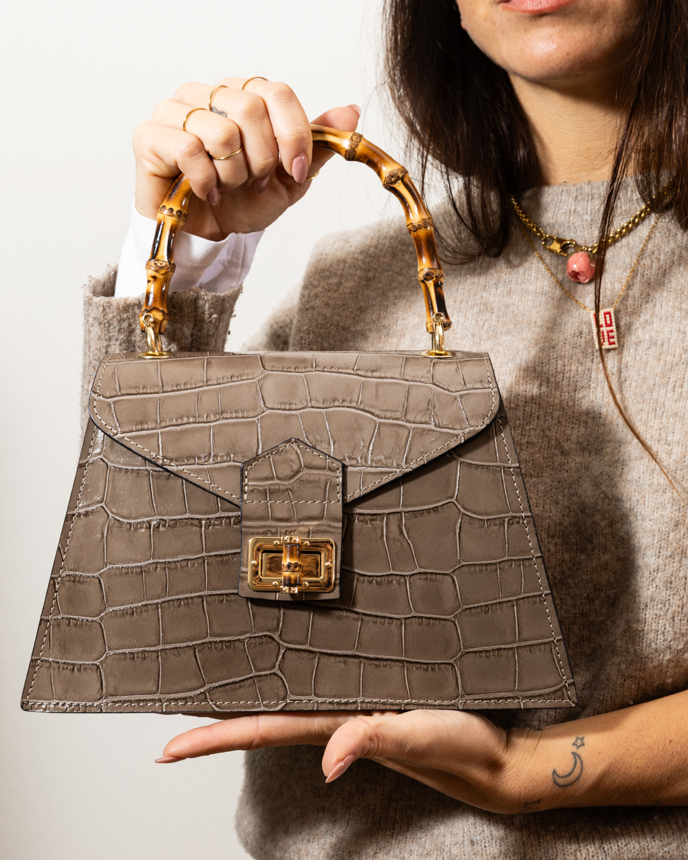 The true highlight is the genuine bamboo handle, masterfully handcrafted to provide an organic and sophisticated touch. Finished with a gold-tone twist-lock closure featuring a matching bamboo detail, the Goji bag is designed for the woman who isn’t afraid to make a statement. Thanks to the internal shoulder strap, it effortlessly transforms from an elegant handbag into a practical companion for daily challenges.