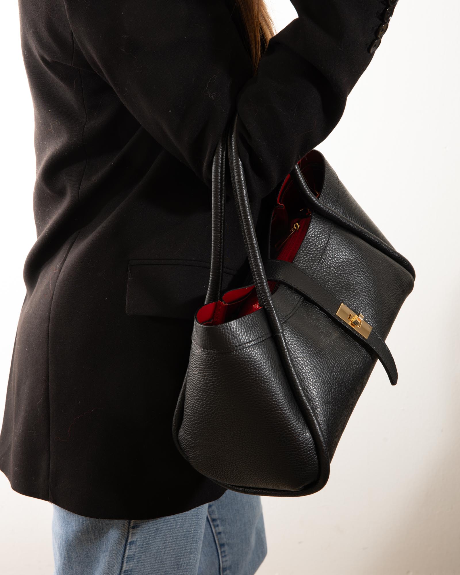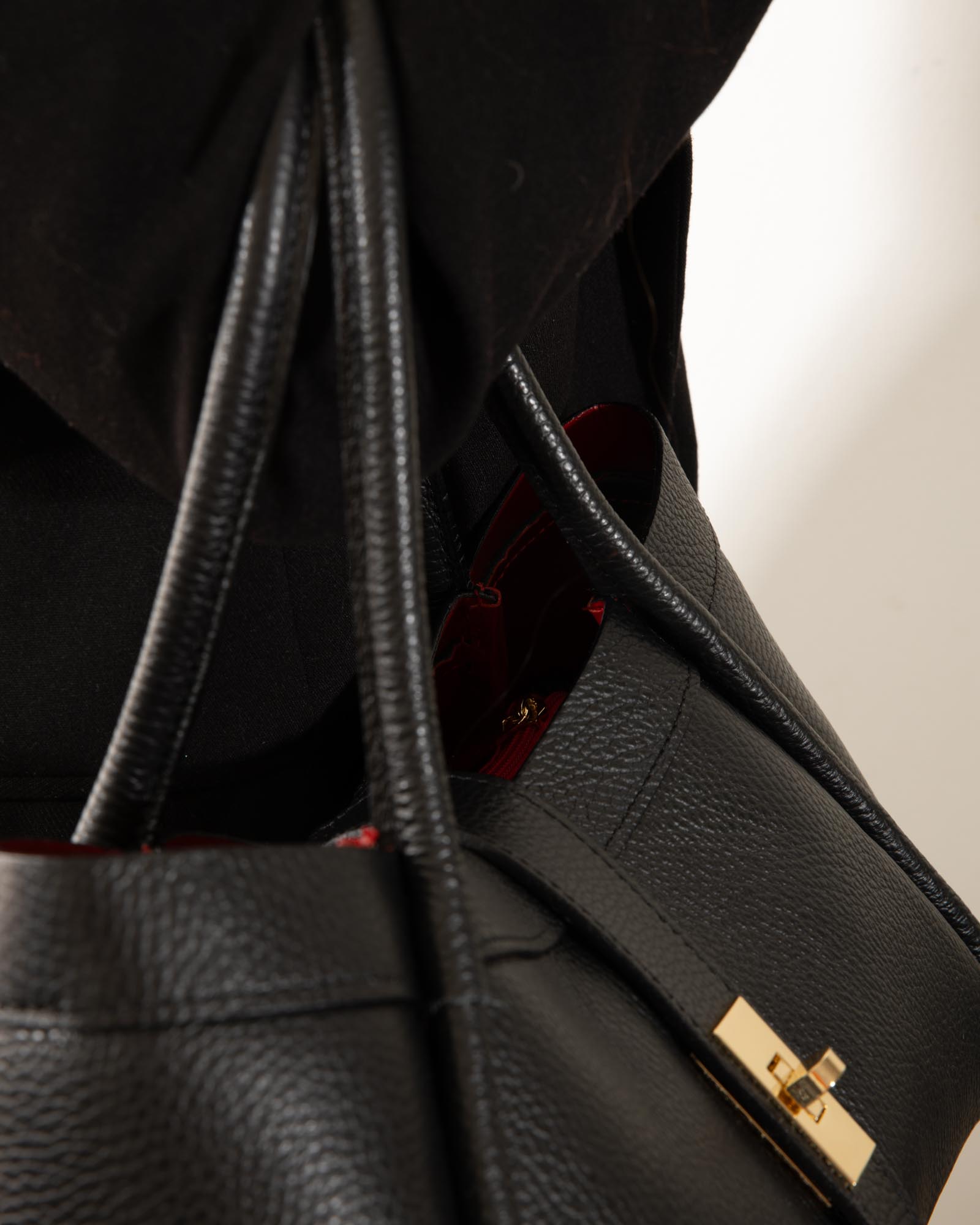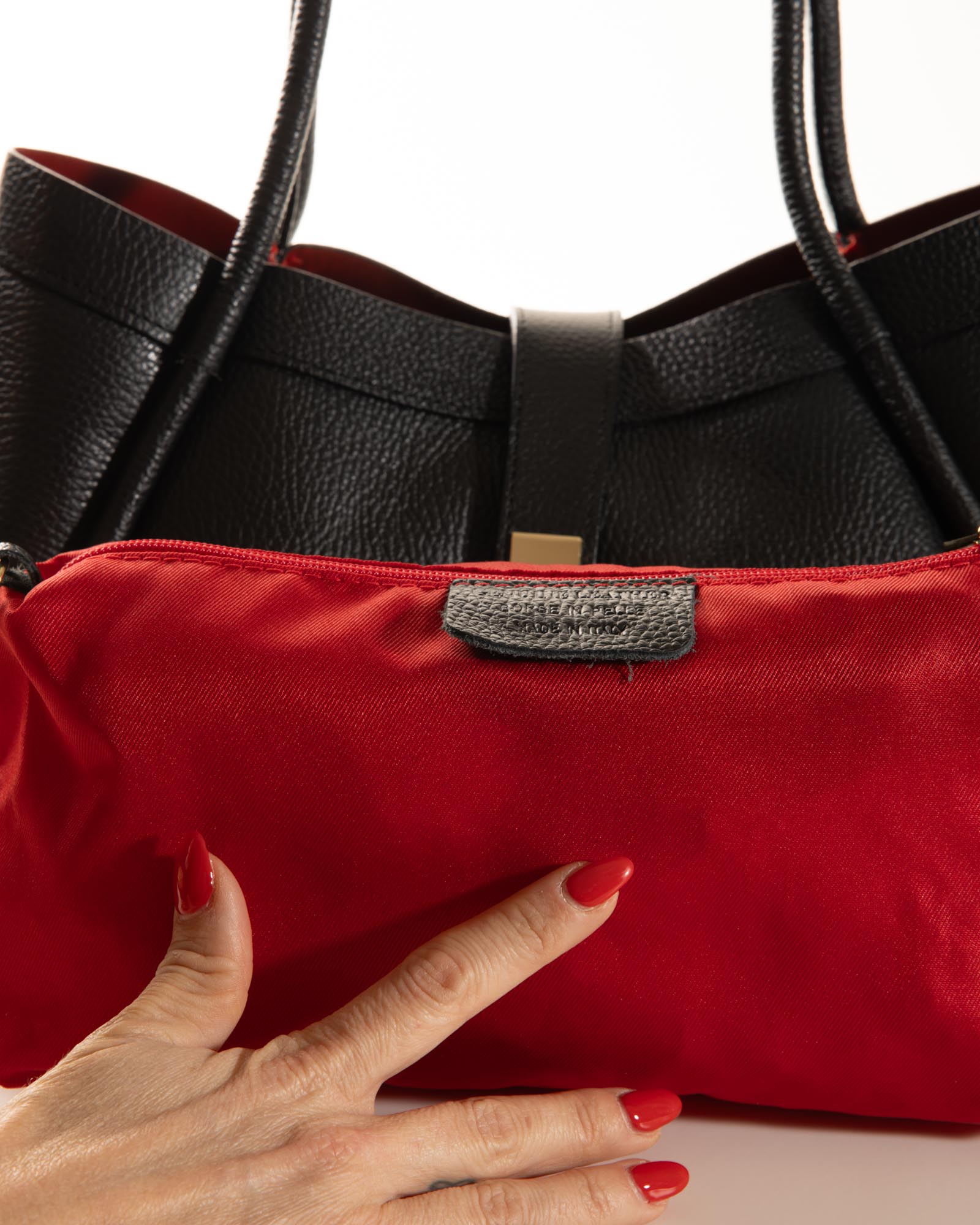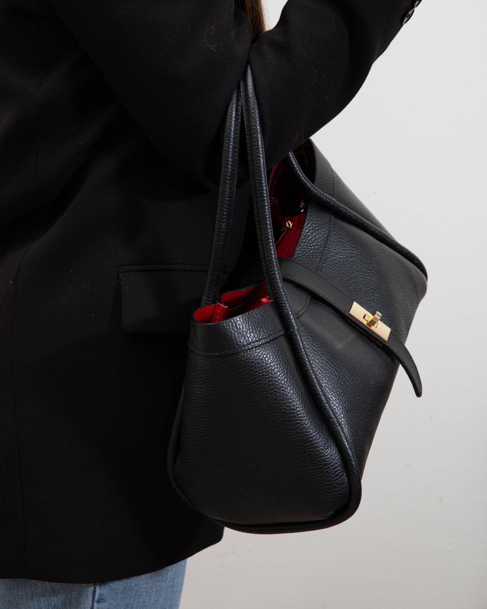 Sophisticated, spacious, and bold: the Miranda bag is the ultimate accessory for those seeking a blend of exterior poise and a vibrant soul. Crafted from premium black pebbled leather, it reveals its true personality through its bold red lining, creating a high-impact visual contrast.