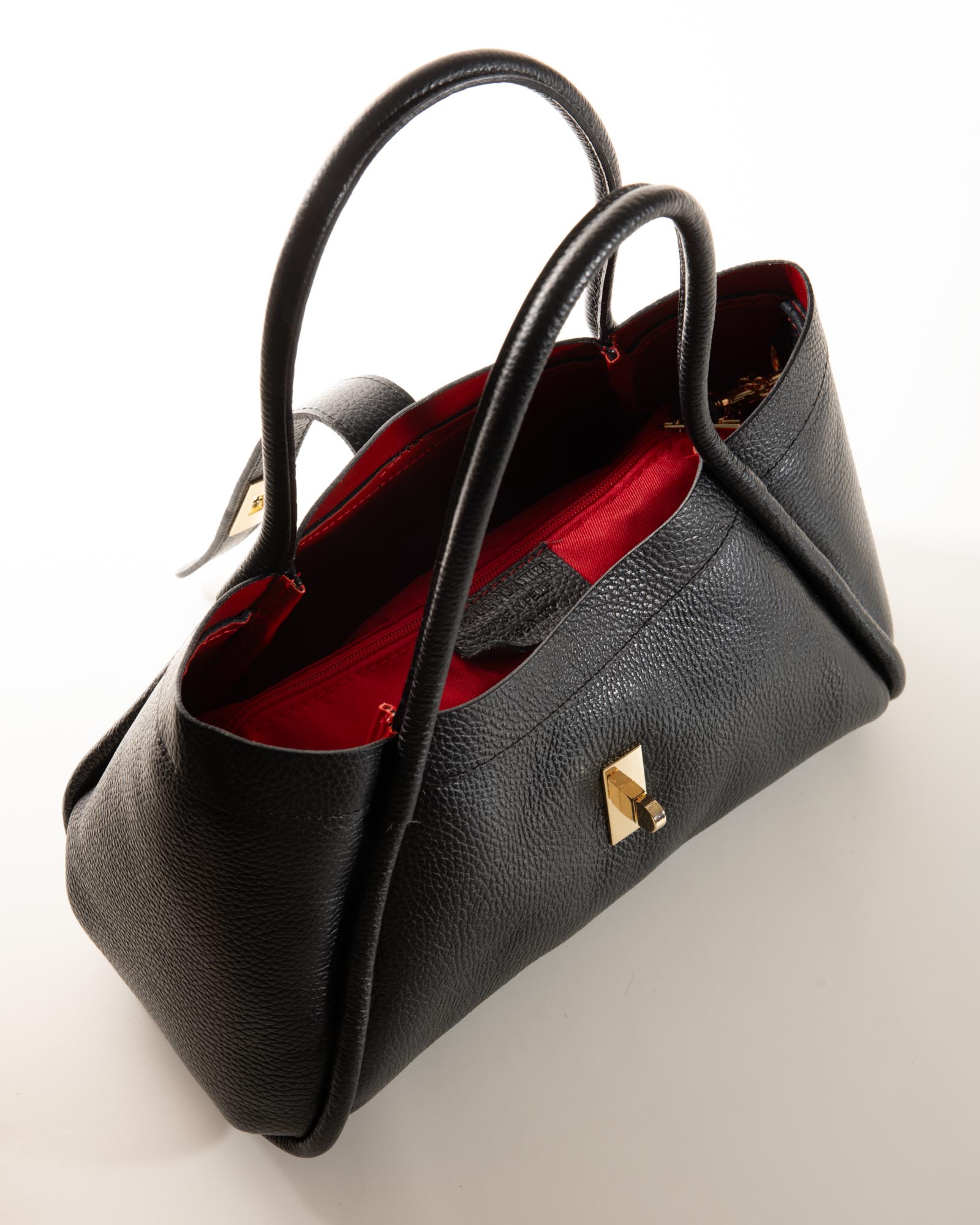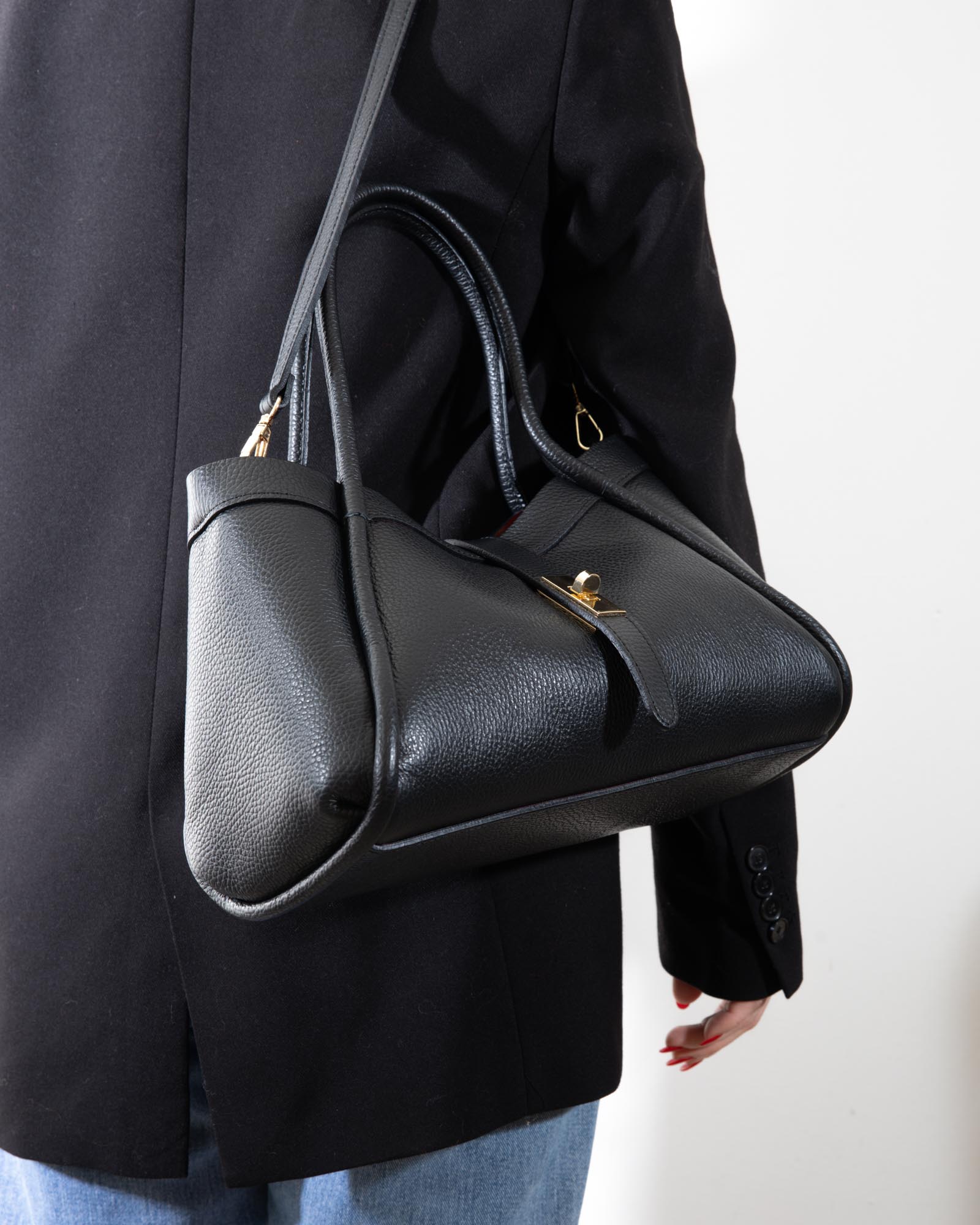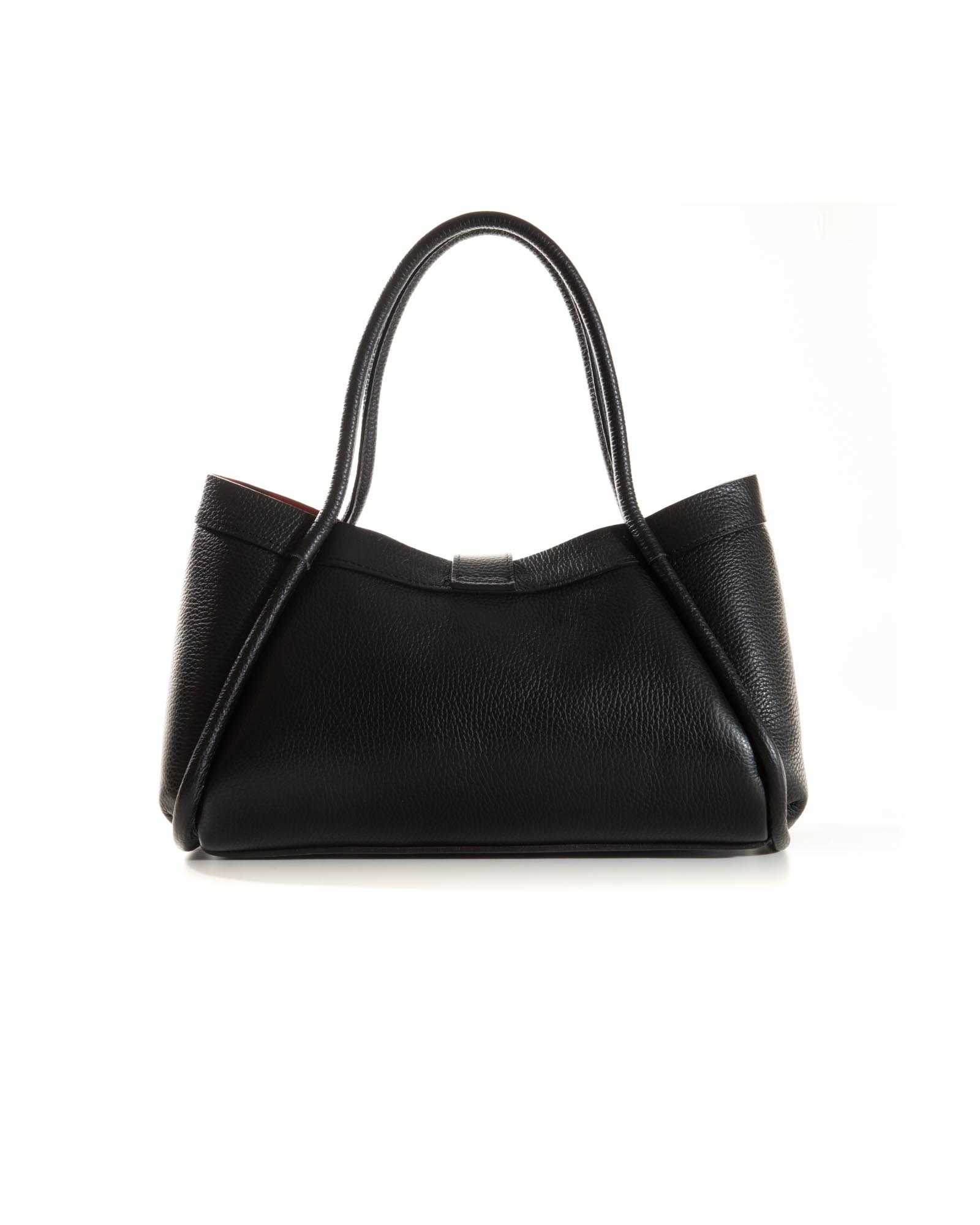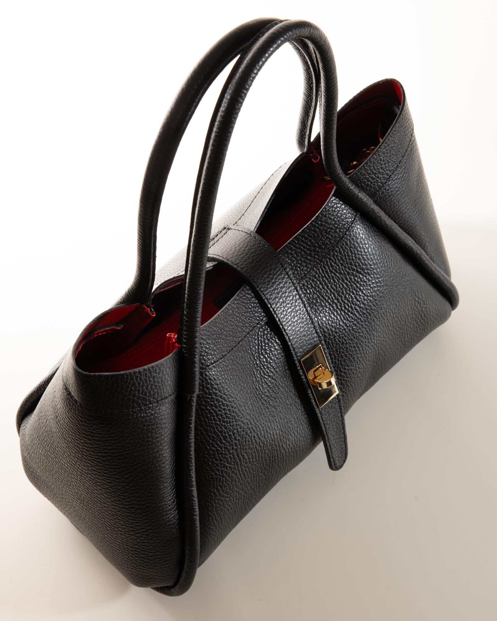 Sophisticated, spacious, and bold: the Miranda bag is the ultimate accessory for those seeking a blend of exterior poise and a vibrant soul. Crafted from premium black pebbled leather, it reveals its true personality through its bold red lining, creating a high-impact visual contrast.
