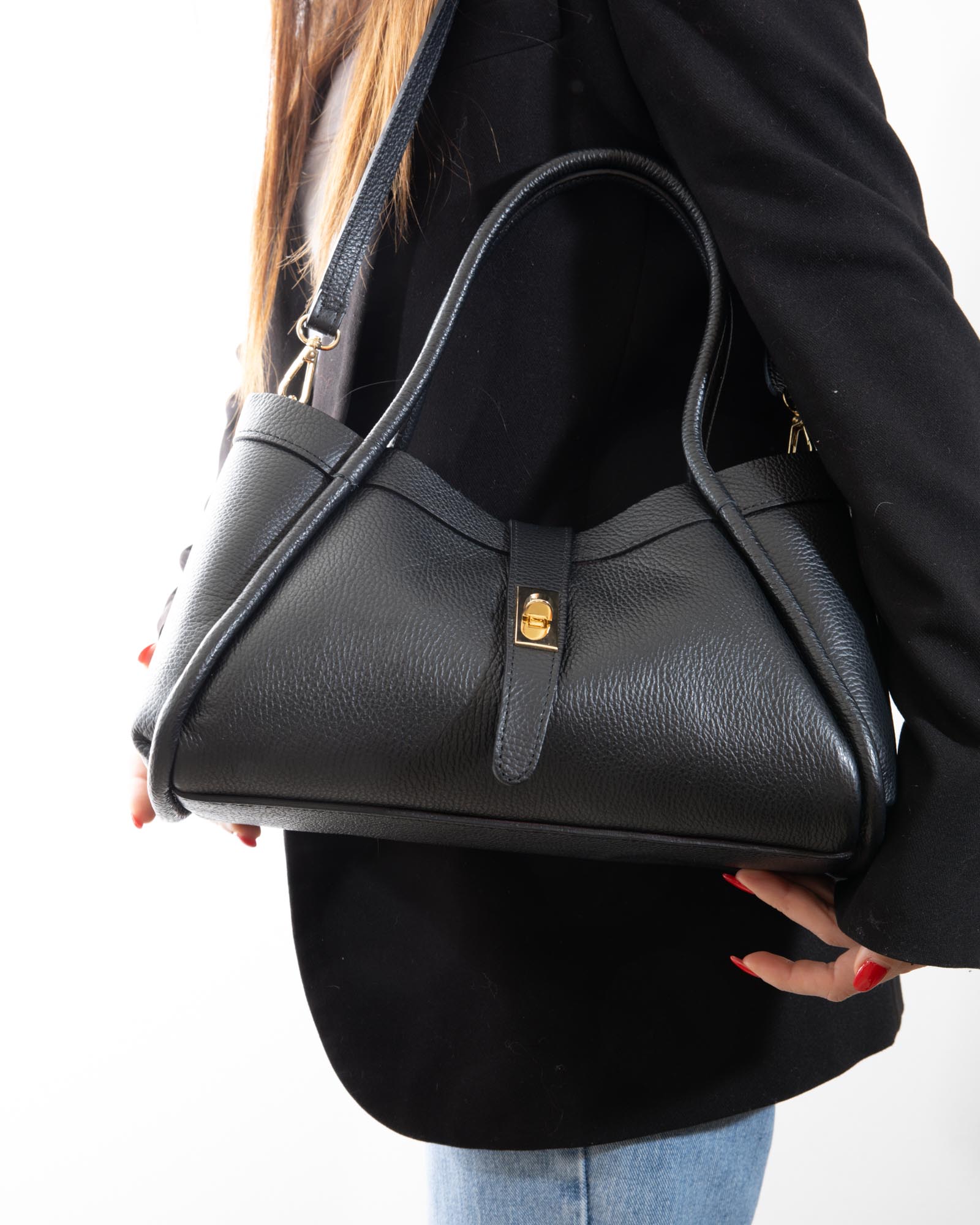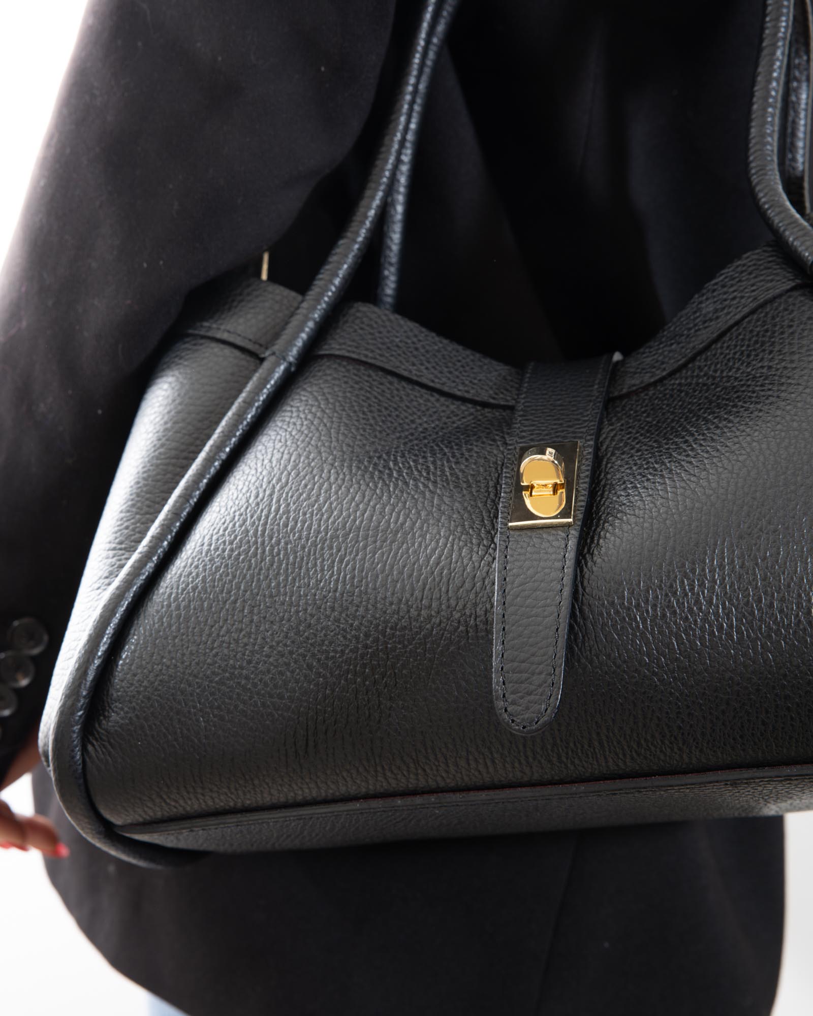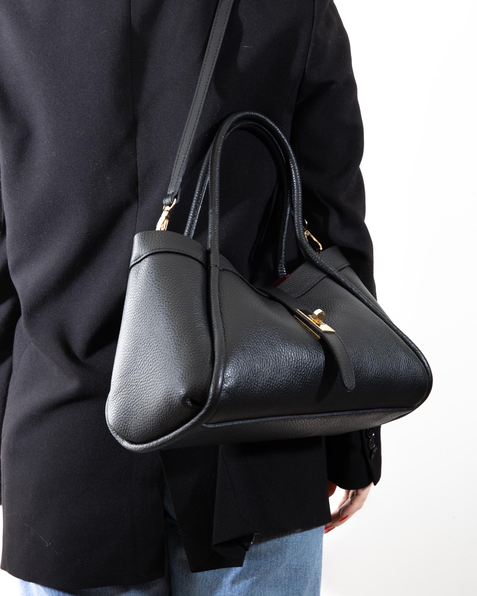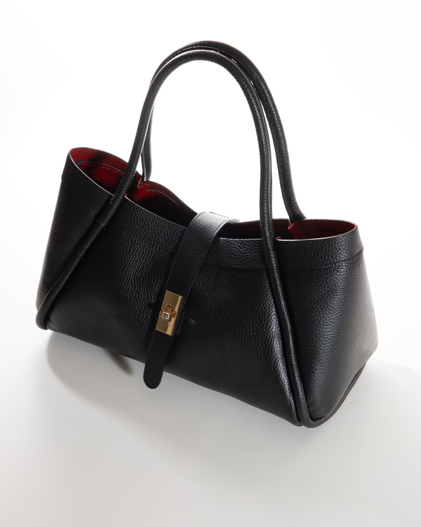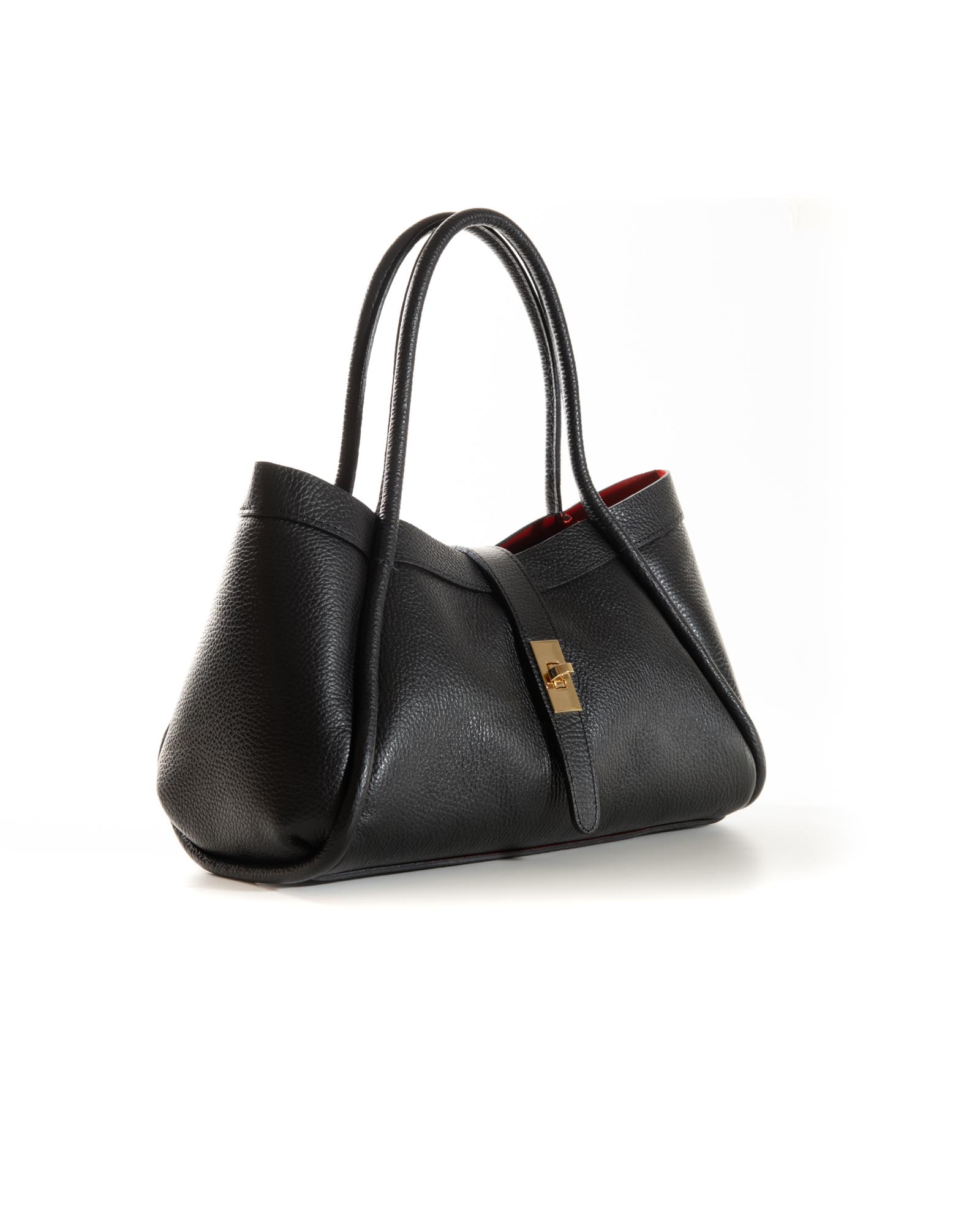 Sophisticated, spacious, and bold: the Miranda bag is the ultimate accessory for those seeking a blend of exterior poise and a vibrant soul. Crafted from premium black pebbled leather, it reveals its true personality through its bold red lining, creating a high-impact visual contrast.