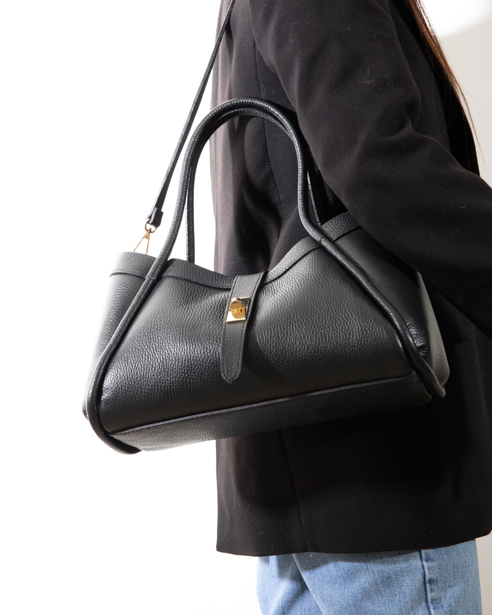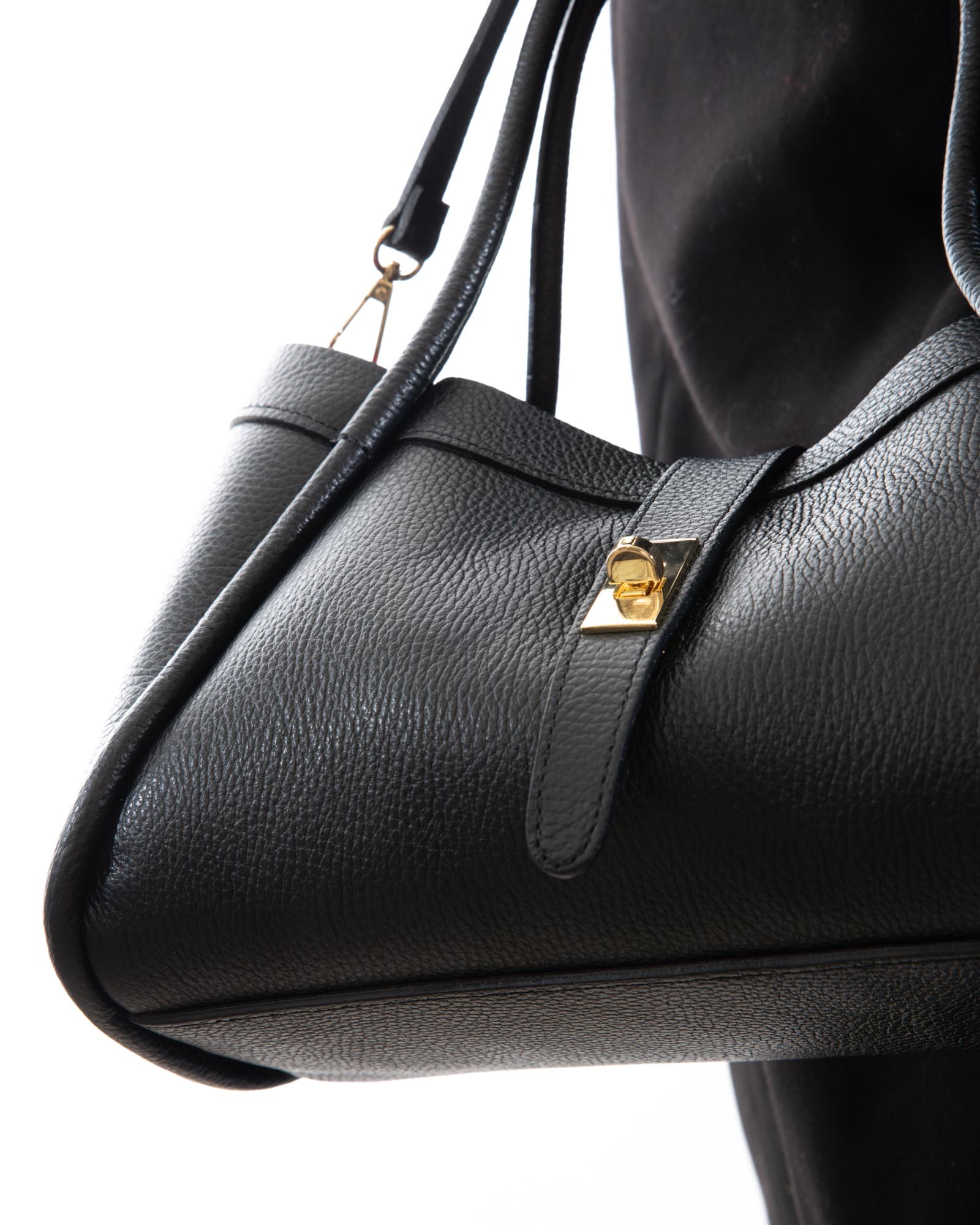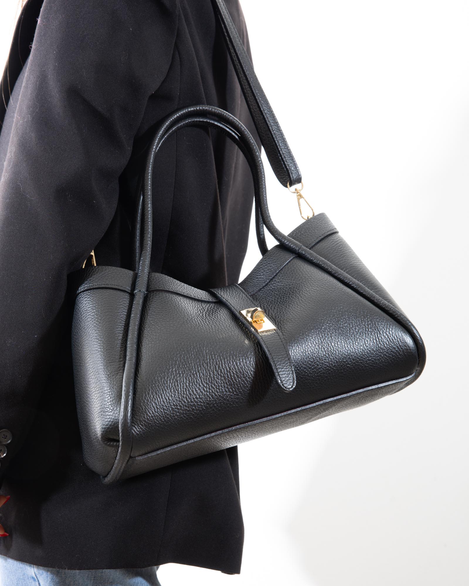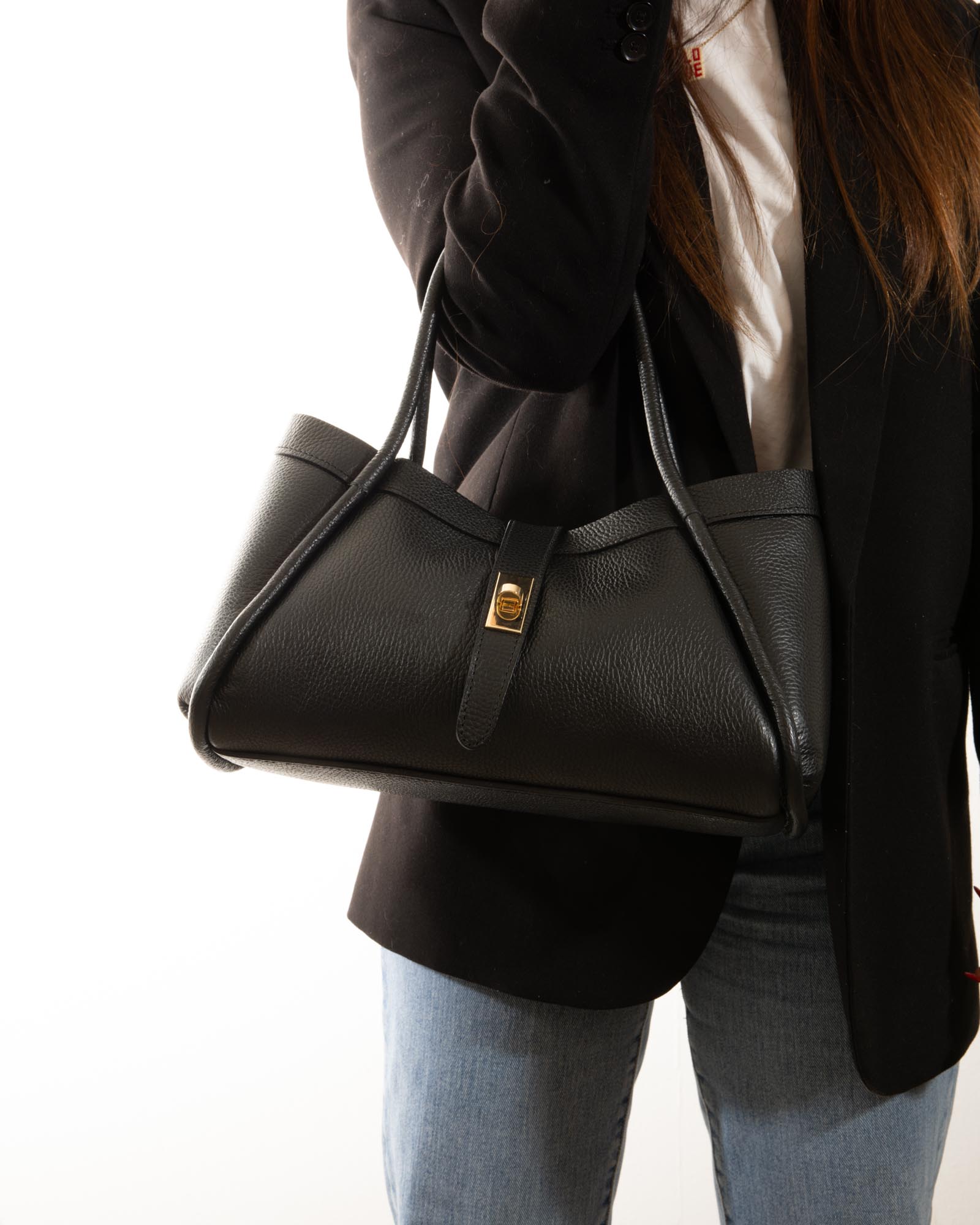 Sophisticated, spacious, and bold: the Miranda bag is the ultimate accessory for those seeking a blend of exterior poise and a vibrant soul. Crafted from premium black pebbled leather, it reveals its true personality through its bold red lining, creating a high-impact visual contrast.