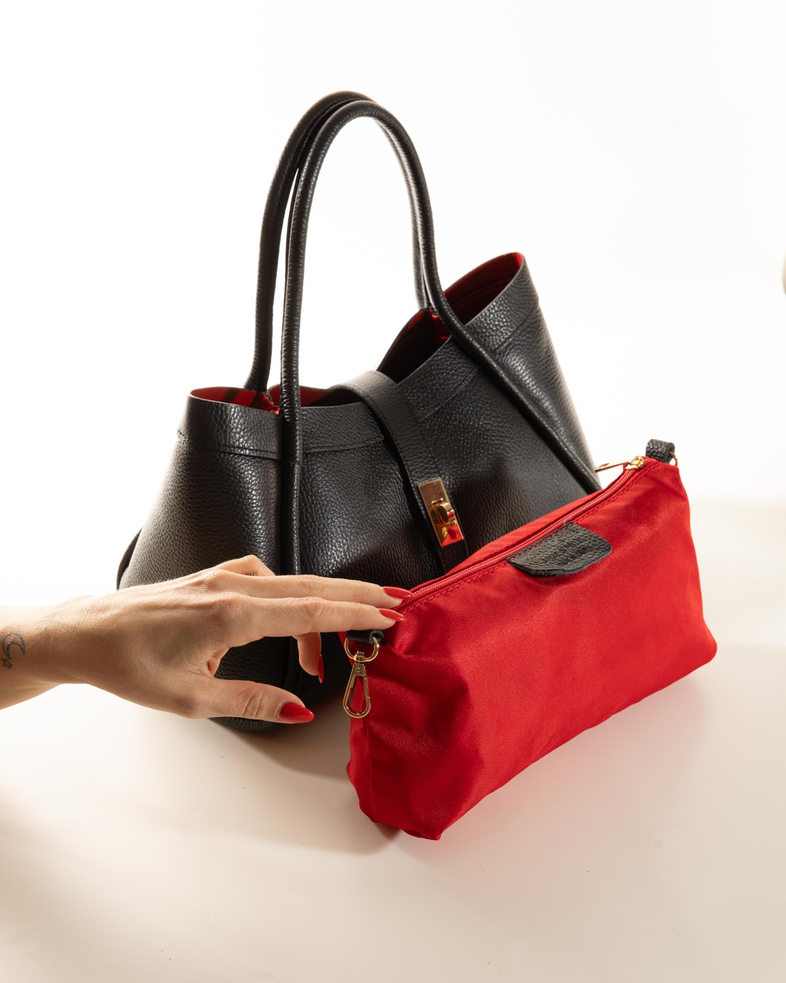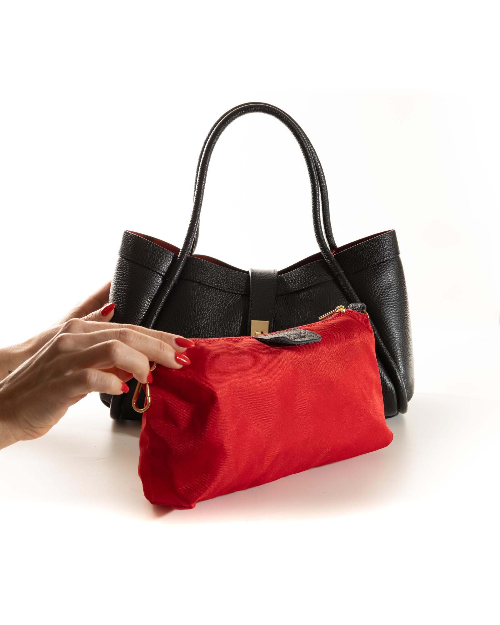 The design is defined by a sculptural silhouette featuring a gold-toned twist-lock closure and elegant tubular handles. Miranda is not just about looks; it’s highly functional, housing a matching red fabric pouch inside for perfect organization, along with an included internal shoulder strap for an easy transition from a refined handbag to a practical crossbody. An iconic piece of Made in Italy craftsmanship.